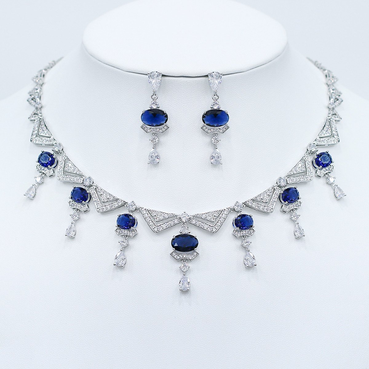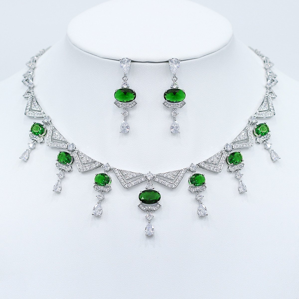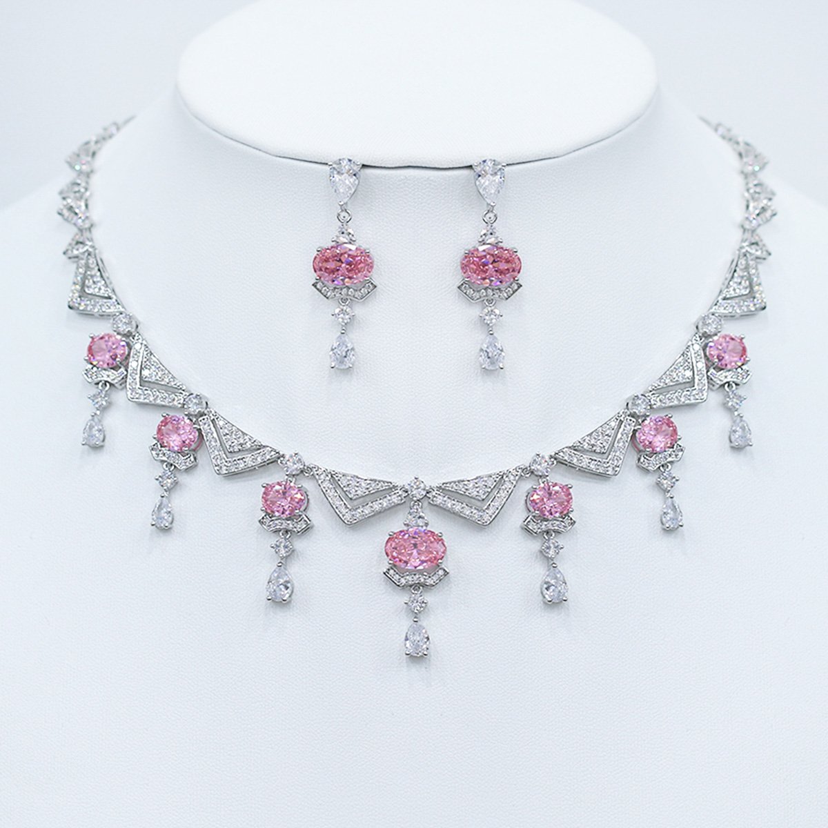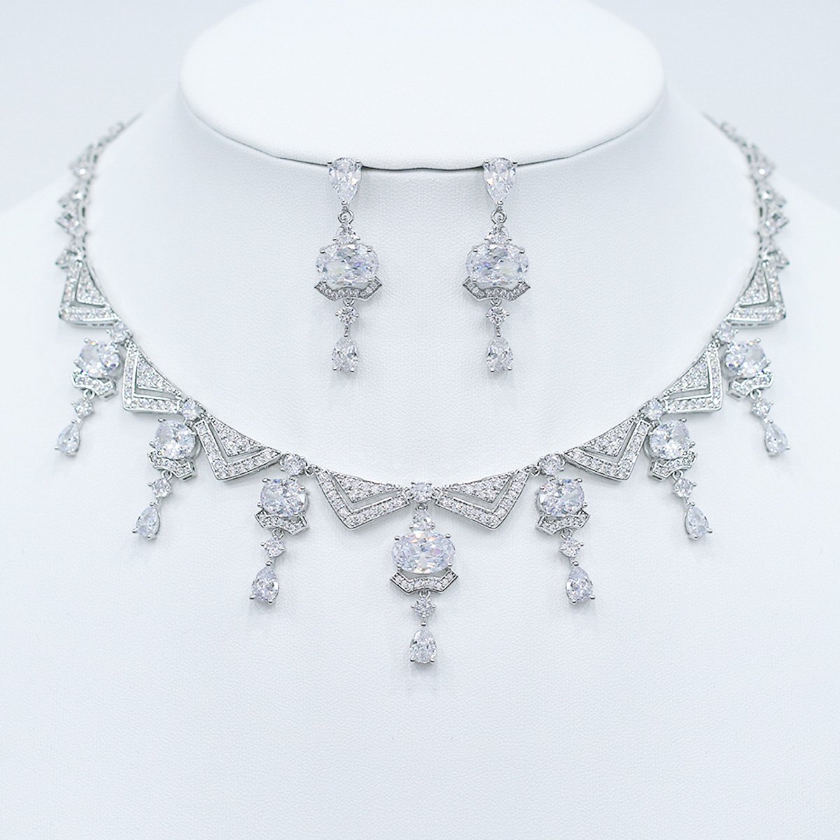 Discover our elegant Wholesale Statement Zircon Necklace Set, a perfect blend of intricate design and brilliant sparkle. This stunning jewelry set features a bold, geometric-inspired necklace and matching dangle earrings, adorned with large oval-cut and micro-pavé zircon stones. Crafted from durable brass and expertly plated with platinum, this set exudes luxury and sophistication. Ideal for special occasions and upscale collections, its high-quality construction and unique design make it a must-have for boutiques and resellers. As a top wholesale jewelry supplier, we offer this original design at competitive factory-direct prices, with free worldwide shipping to boost your business profitability. Attract new customers and elevate your sales with this magnificent, eye-catching set.