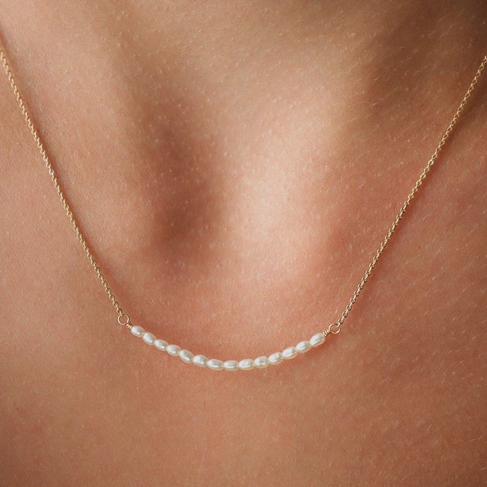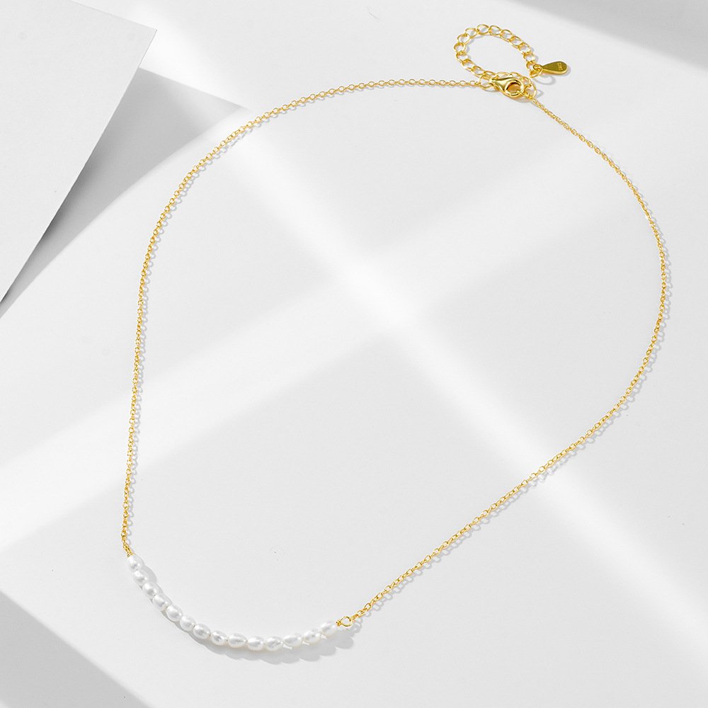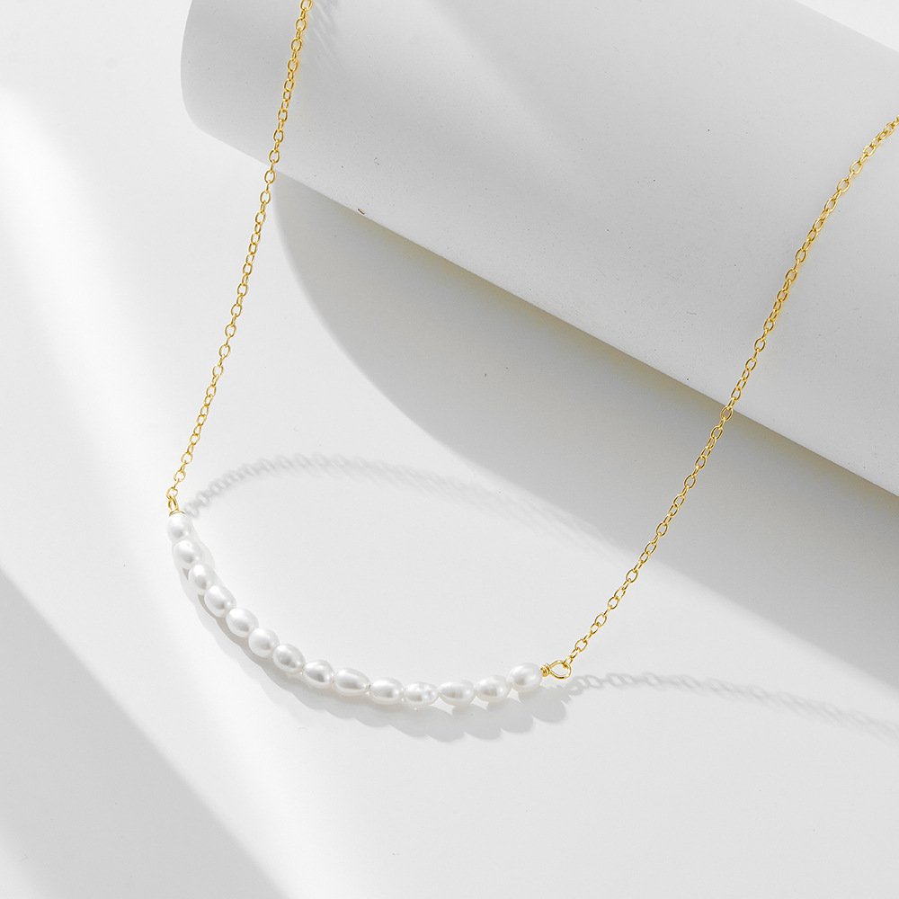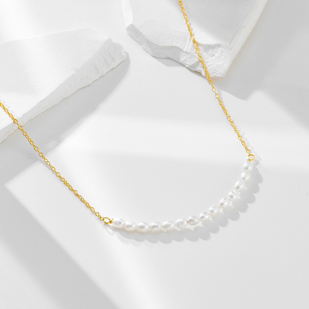 Graceful and versatile, our Wholesale Sterling Silver Pearl Bar Necklace features a sleek horizontal row of natural rice-shaped freshwater pearls, symbolizing balance and elegance. Expertly crafted from S925 sterling silver and finished with radiant 18K gold plating, this minimalist design complements any outfit, from casual to formal. Its ins-style simplicity and timeless charm make it a bestseller for fashion boutiques, gift shops, and global resellers. Whether worn solo or layered, this necklace adds effortless luxury to your inventory. Available now at factory-direct pricing, with free worldwide shipping—exclusively from JuneJewelry.com.