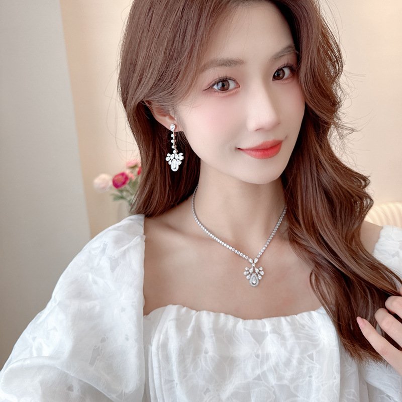 levate your bridal accessory collection with our Wholesale Tassel Bridal Jewelry Set, featuring long drop earrings and a matching necklace designed for brides and formal occasions. This set showcases waterdrop-shaped crystals and delicate crown detailing, offering a romantic, ethereal French-inspired design perfect for weddings, evening parties, and luxury events.