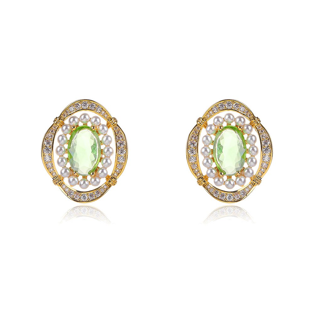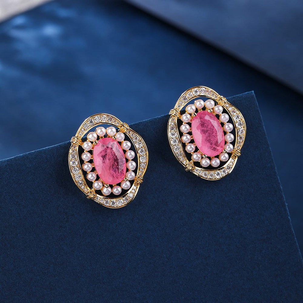 Wholesale Vintage Pearl Earrings bring a touch of royal elegance to your current fashion jewelry collection with ease. We crafted these ornate stud earrings with a durable copper base and luxury real gold plating for long-term wear. The focal point features a vibrant pink oval stone, beautifully framed by delicate shell pearls and shimmering zircon accents.
