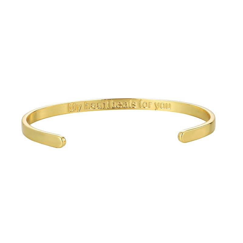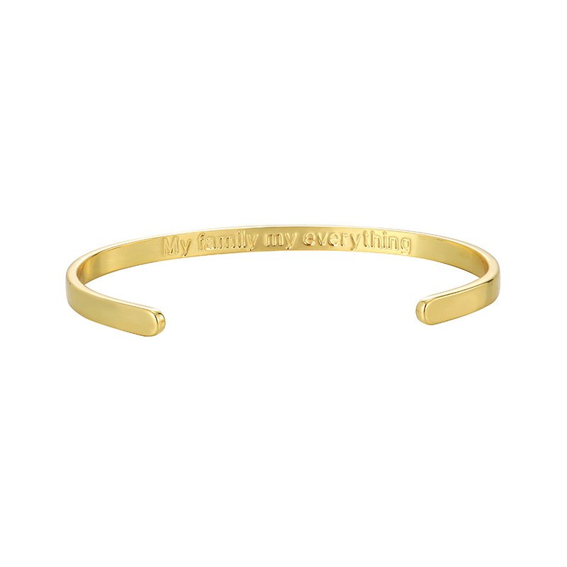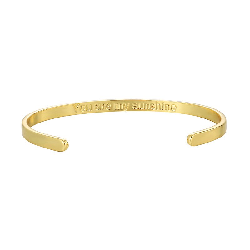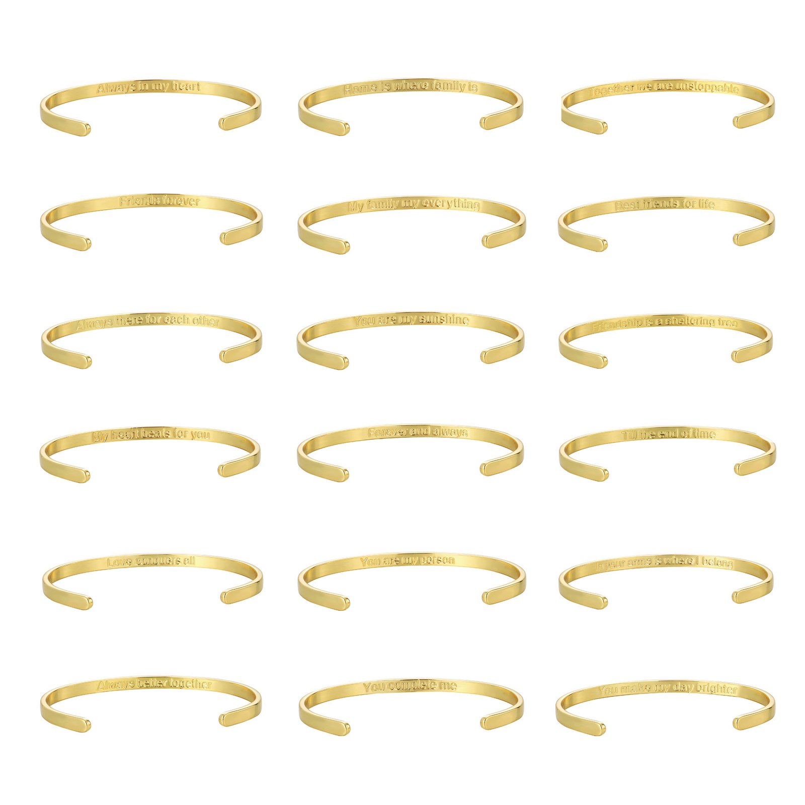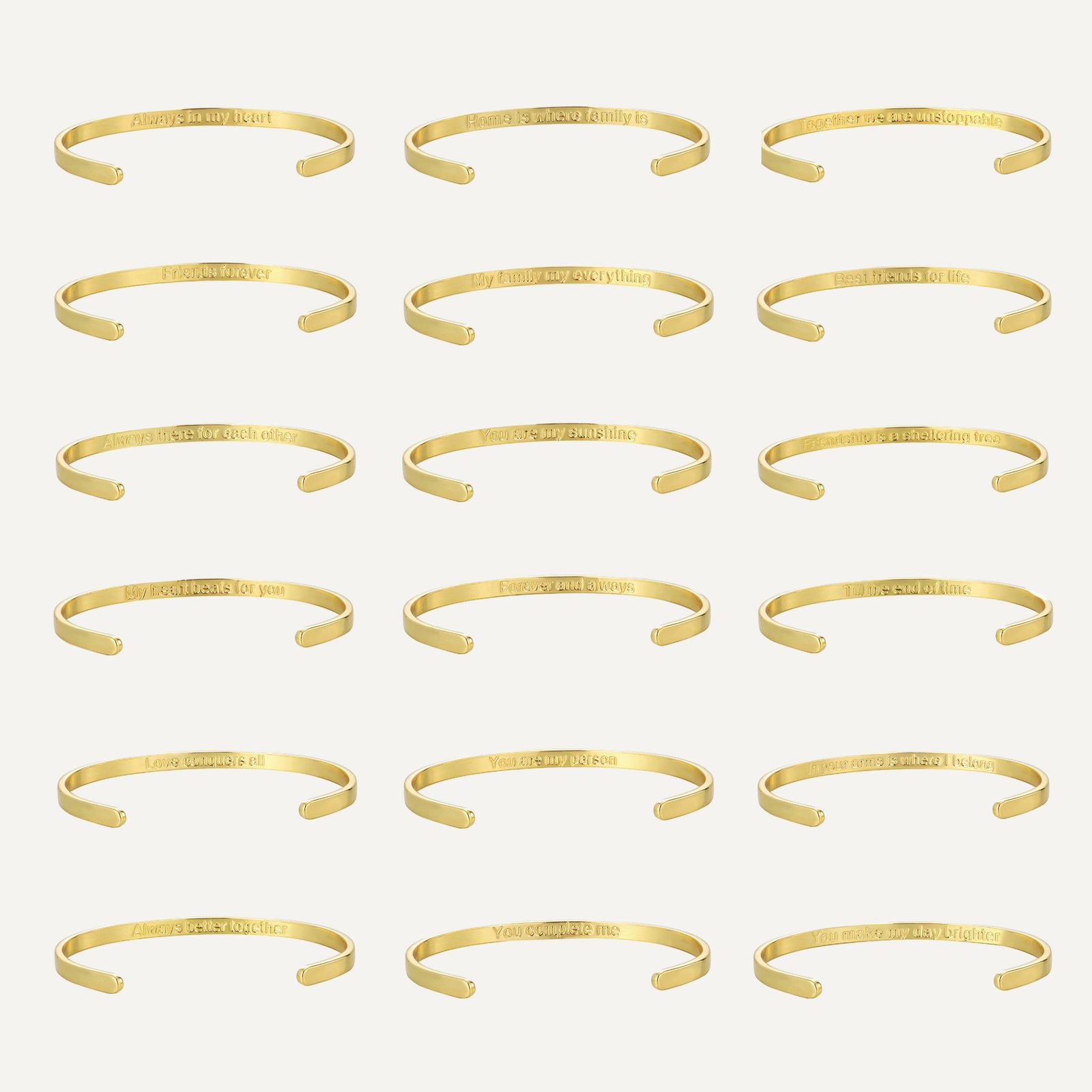 Discover our Wholesale Wishes Cuff Bracelet. This minimalist, European-style open cuff design, crafted from 14K gold plated copper, features 18 different engraved good words message options. This chic and adjustable bracelet adds a touch of personalized inspiration to any outfit.