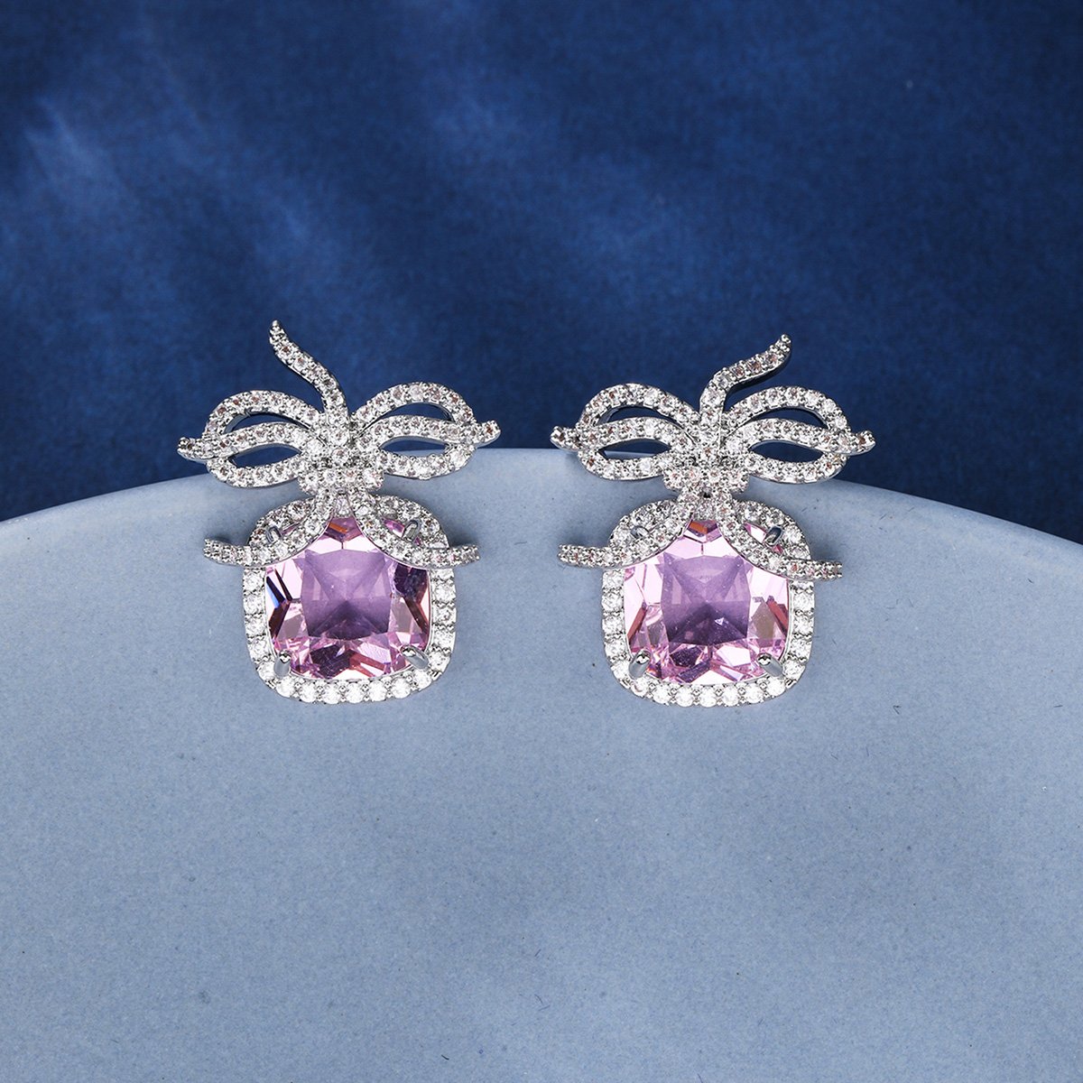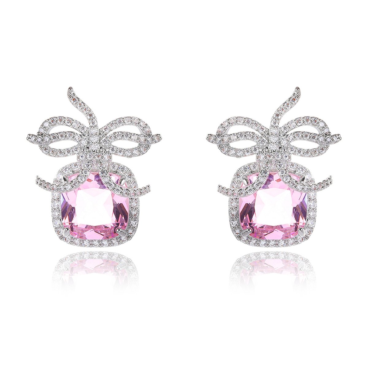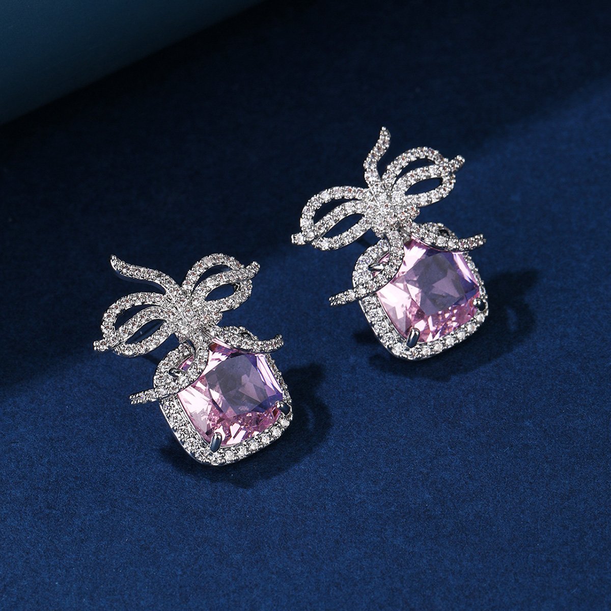 Wholesale Zircon Bow Earrings are an essential addition to any collection. We’ve designed these earrings with a blend of sophistication and whimsy. The exquisite craftsmanship is immediately apparent. These earrings feature a large cushion-cut pink zircon center stone. It is surrounded by a brilliant halo of smaller cubic zirconia stones. A beautiful, sparkling bow sits atop the main setting. This detail gives the earrings a unique and charming appeal.