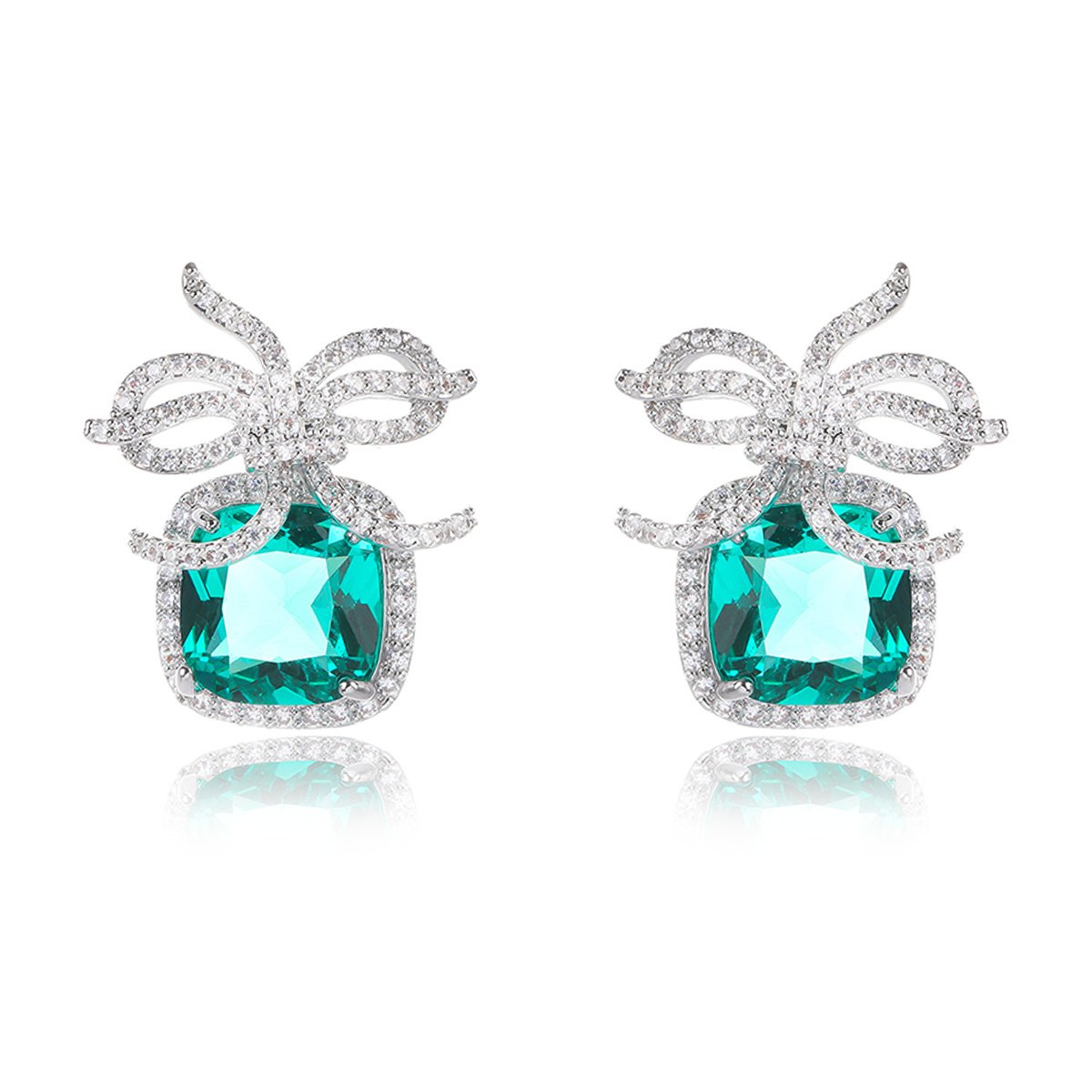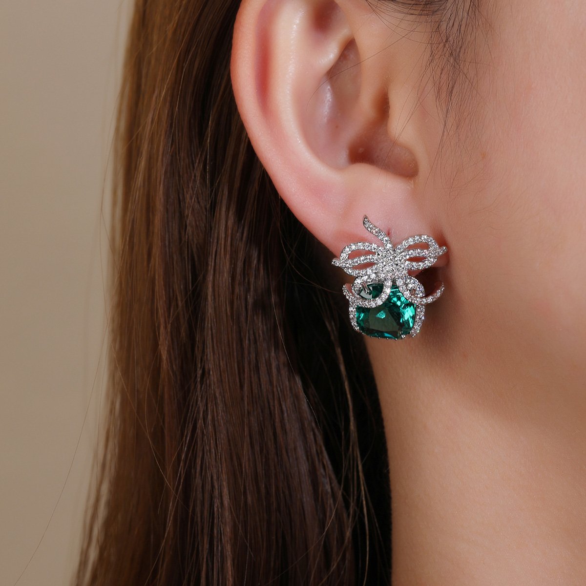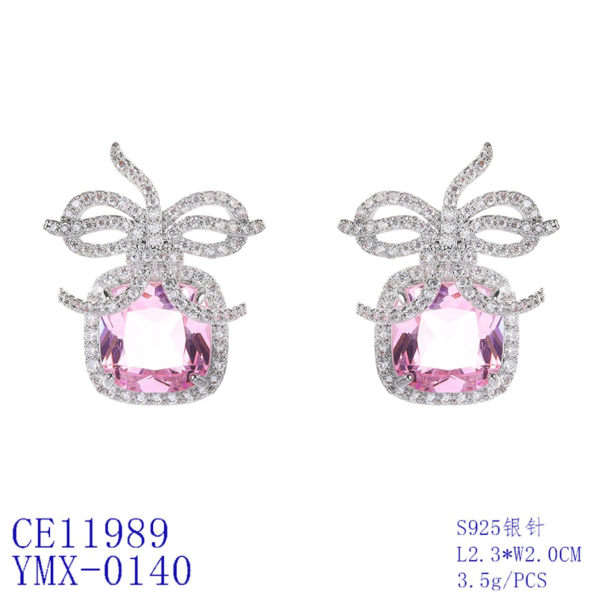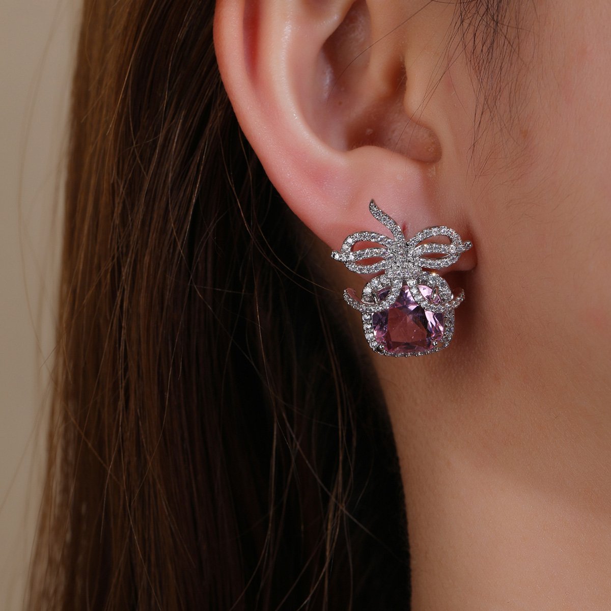 Wholesale Zircon Bow Earrings are an essential addition to any collection. We’ve designed these earrings with a blend of sophistication and whimsy. The exquisite craftsmanship is immediately apparent. These earrings feature a large cushion-cut pink zircon center stone. It is surrounded by a brilliant halo of smaller cubic zirconia stones. A beautiful, sparkling bow sits atop the main setting. This detail gives the earrings a unique and charming appeal.