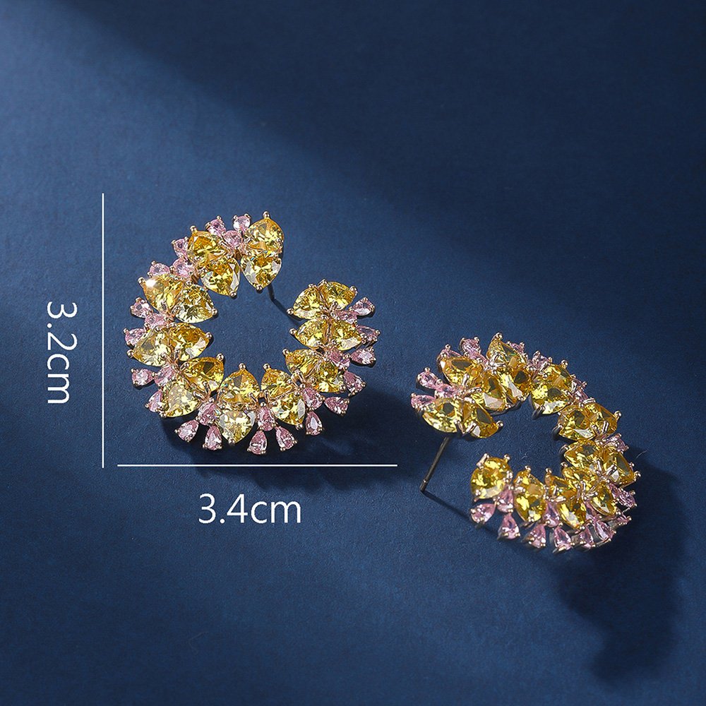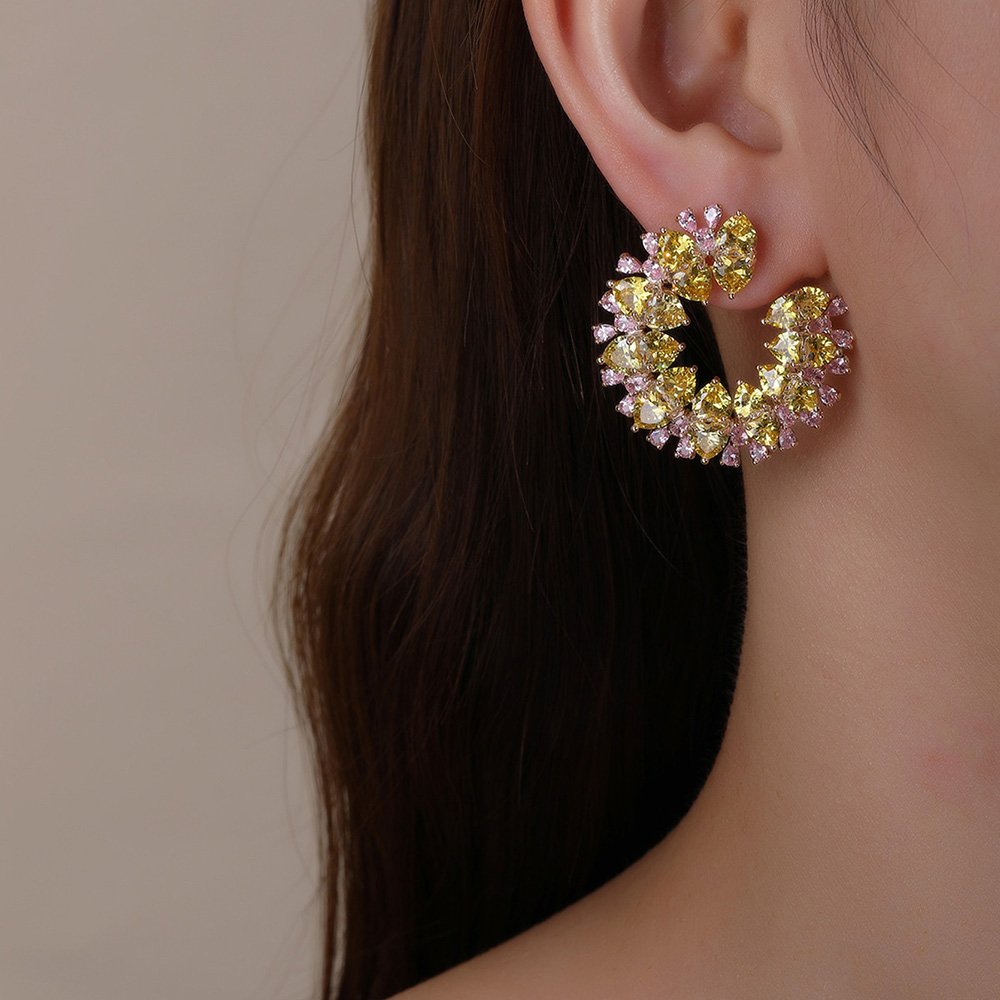 Wholesale yellow zircon hoop earrings with pink accents on real gold plated copper from JuneJewelry.com – luxury fashion jewelry for bulk buyers.