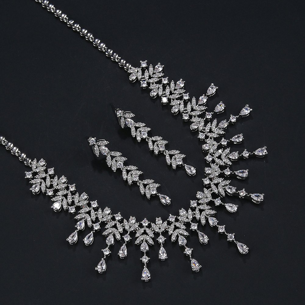 Wholesale platinum zircon set featuring a teardrop pendant and matching earrings in silver-tone copper from JuneJewelry.com – luxury wedding jewelry for bulk orders.