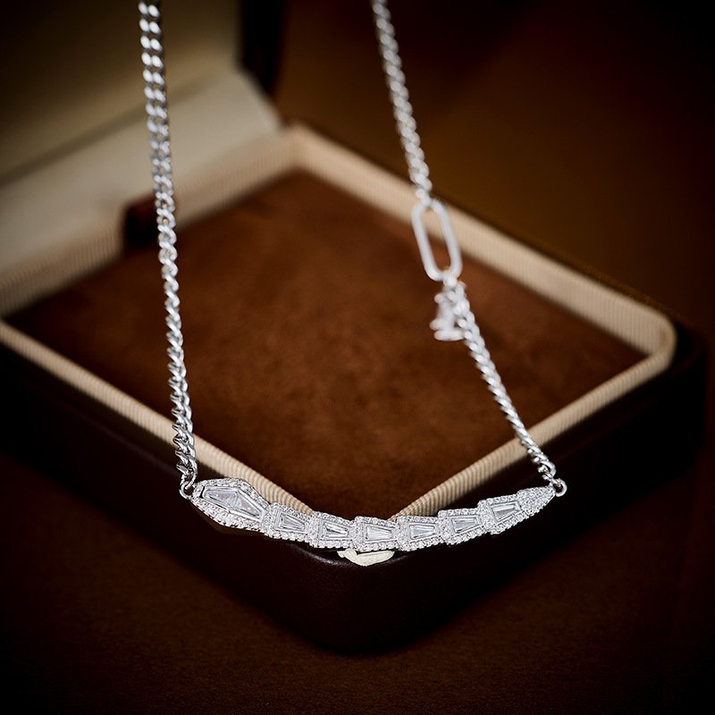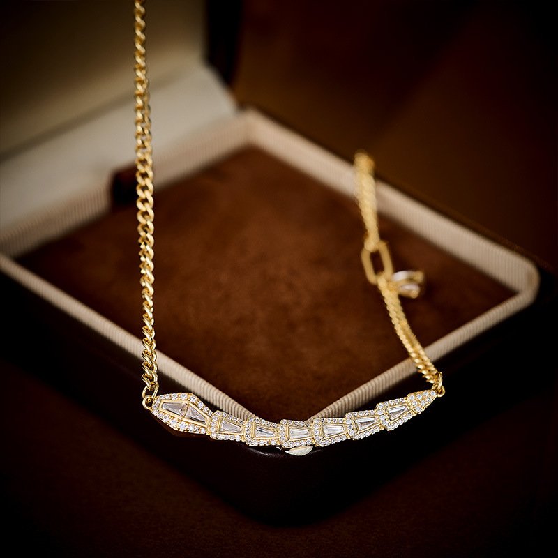 Introducing the new Zircon Snake Jewelry Set, a light luxury collection with a captivating niche designer appeal. This unique set, featuring the elegant serpent/snake motif, is crafted from copper and plated with premium White Gold / 18K gold for a long-lasting, brilliant finish. The pieces are adorned with high-quality zircon stones, adding a delicate sparkle and an advanced, high-end sense to the entire look. The set includes a choker necklace, earrings, and a matching ring, making it a complete, sophisticated accessory package. Perfect for wholesale buyers seeking distinctive and refined pieces that stand out. At junejewelry.com, we provide this original, unique product at factory-direct pricing. It is also cheap. We guarantee high quality and include free shipping. Embrace the elegance of the serpent with this stunning set.