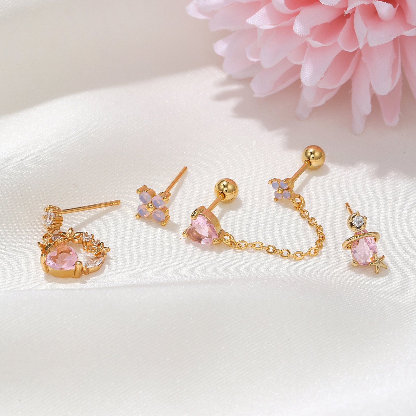 Pink Zirconia flower heart drop stud earrings set wholesale Factory