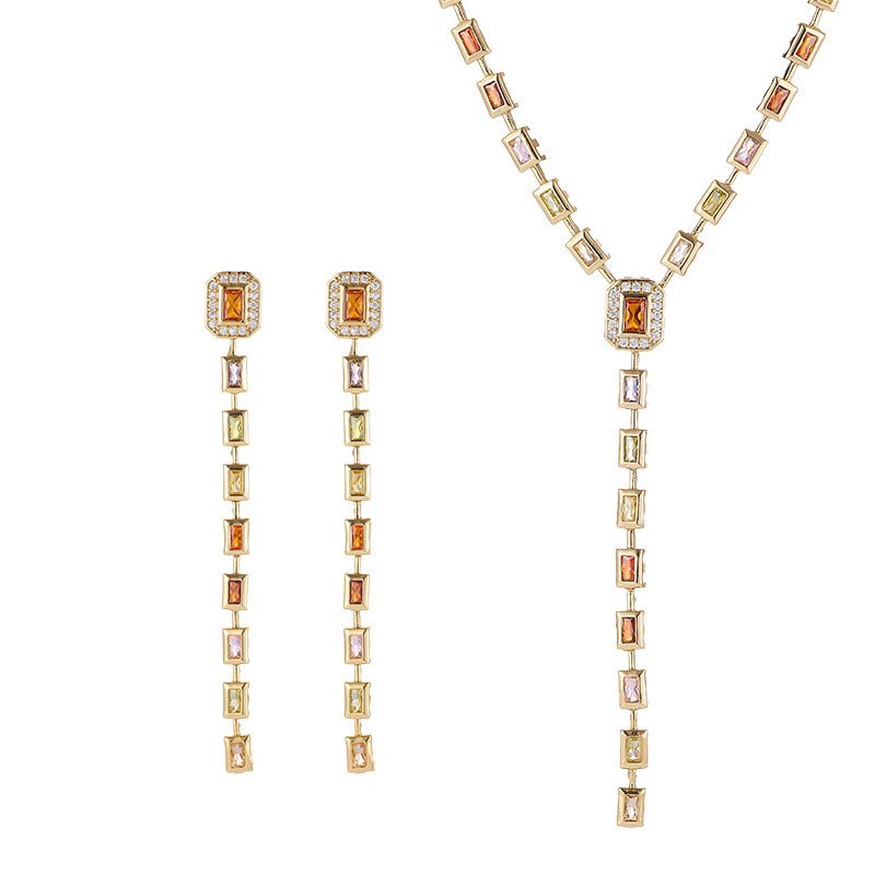 Unveil the elegance of the Colorful Zircon Tassel Set, a stunning light luxury collection. This exquisite set features a striking geometric square design adorned with vibrant, full micro-pave colorful zircon stones. The set includes a long, flowy tassel necklace (choker/neck chain style) and matching tassel drop earrings, creating an elevated and sophisticated look. Crafted from copper and finished with 18K Real Gold Plated electroplating, it offers a luxurious and durable shine. This collection is perfect for wholesale buyers seeking glamorous, on-trend statement pieces with a high-end feel. At junejewelry.com, we provide this original, unique product at factory-direct pricing. It is also cheap. We guarantee high quality and include free shipping. Give your customers affordable luxury and sophisticated style.