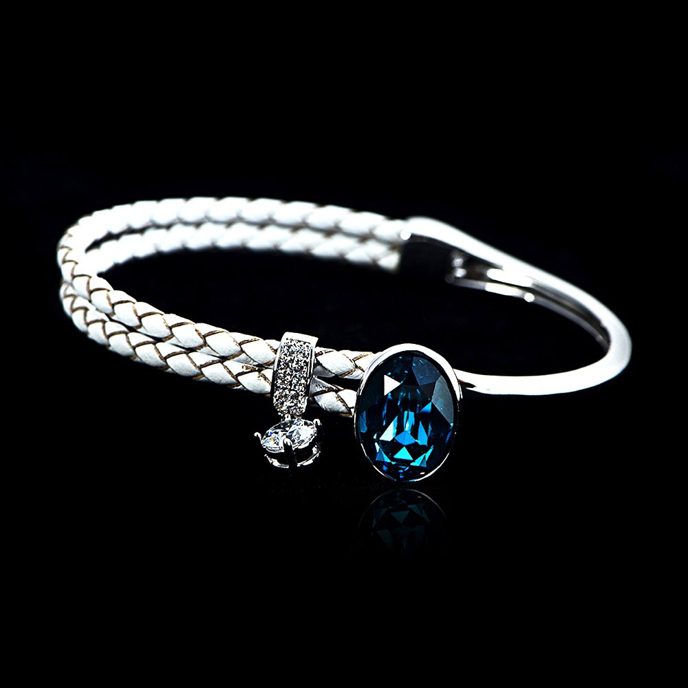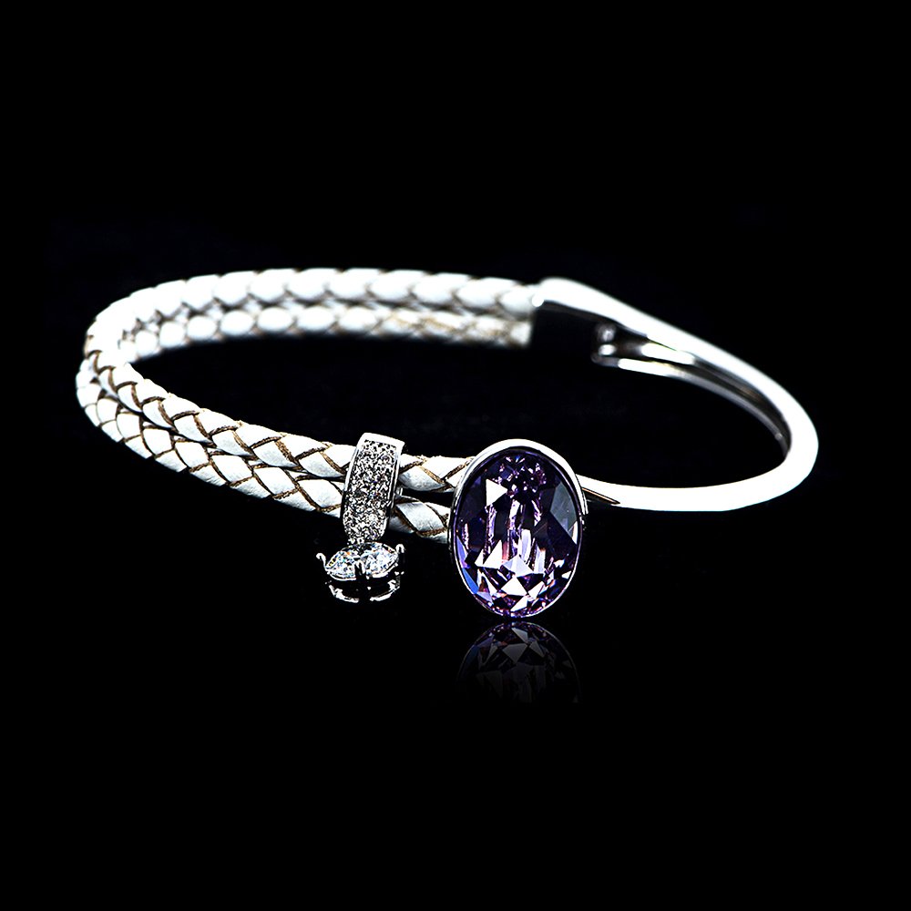 Our Swarovski Elements bangle made from copper and leather with platinum plating features a single, sparkling stone. Its simple design delivers a premium look at a low price.