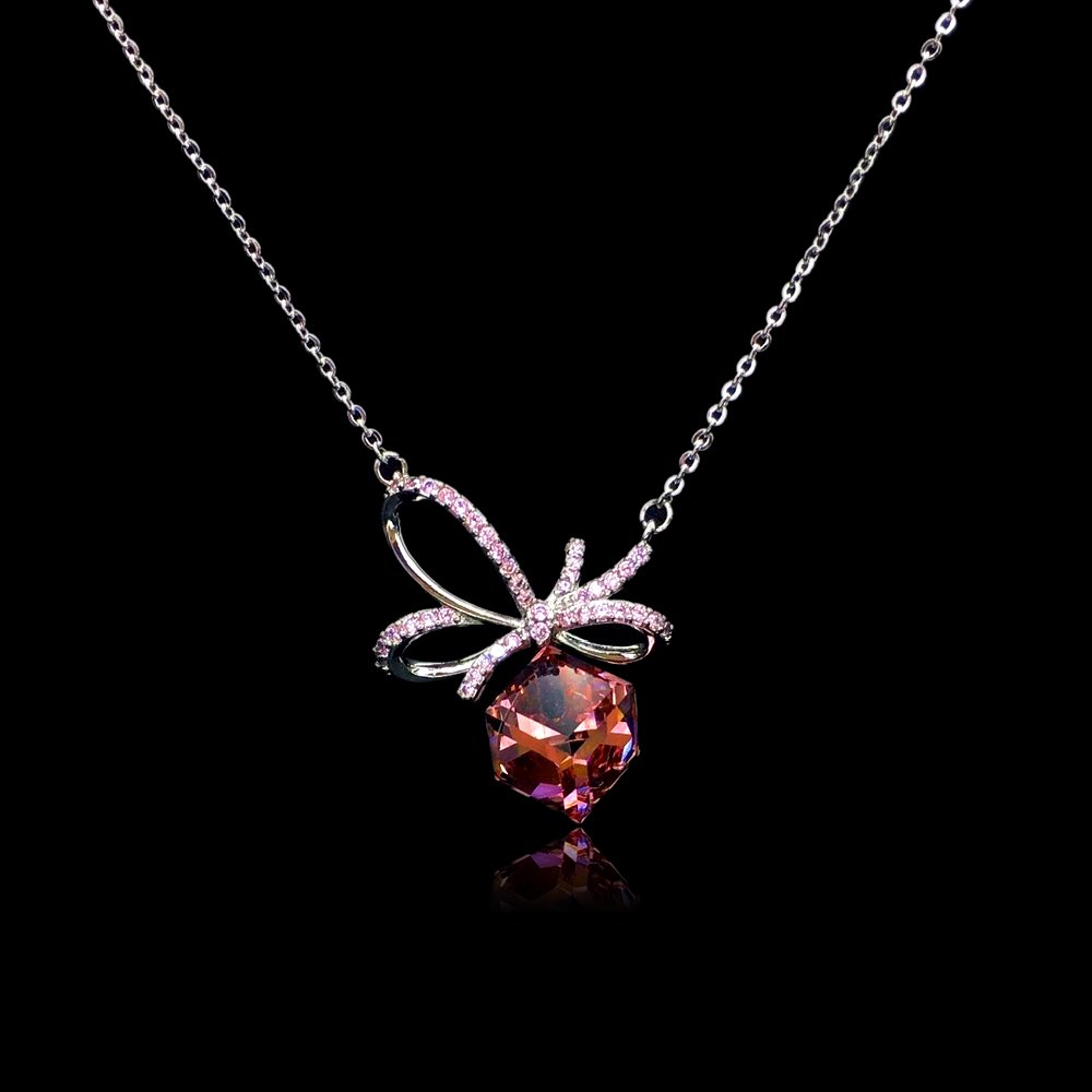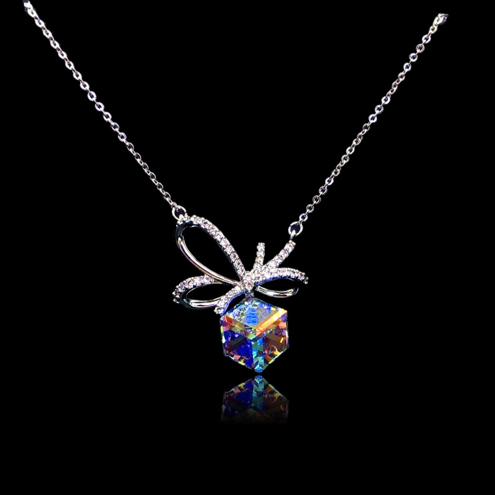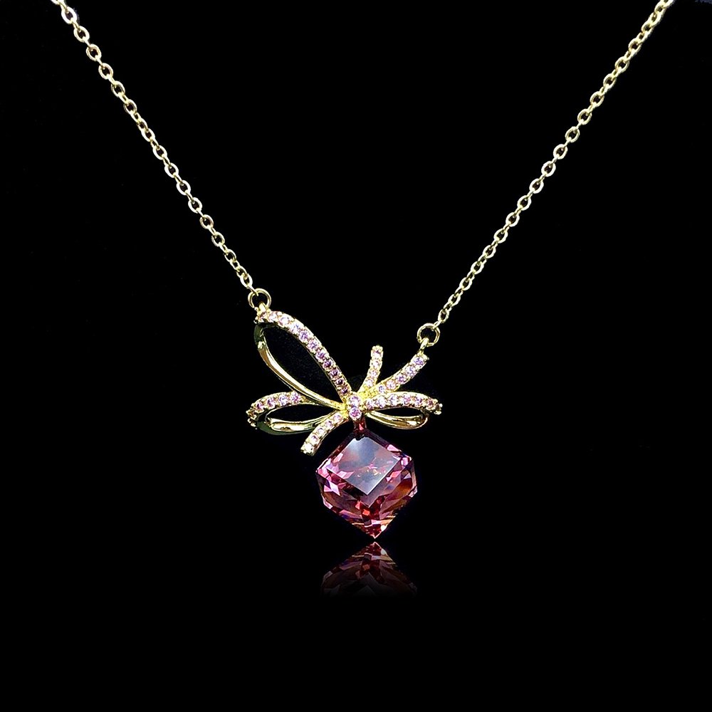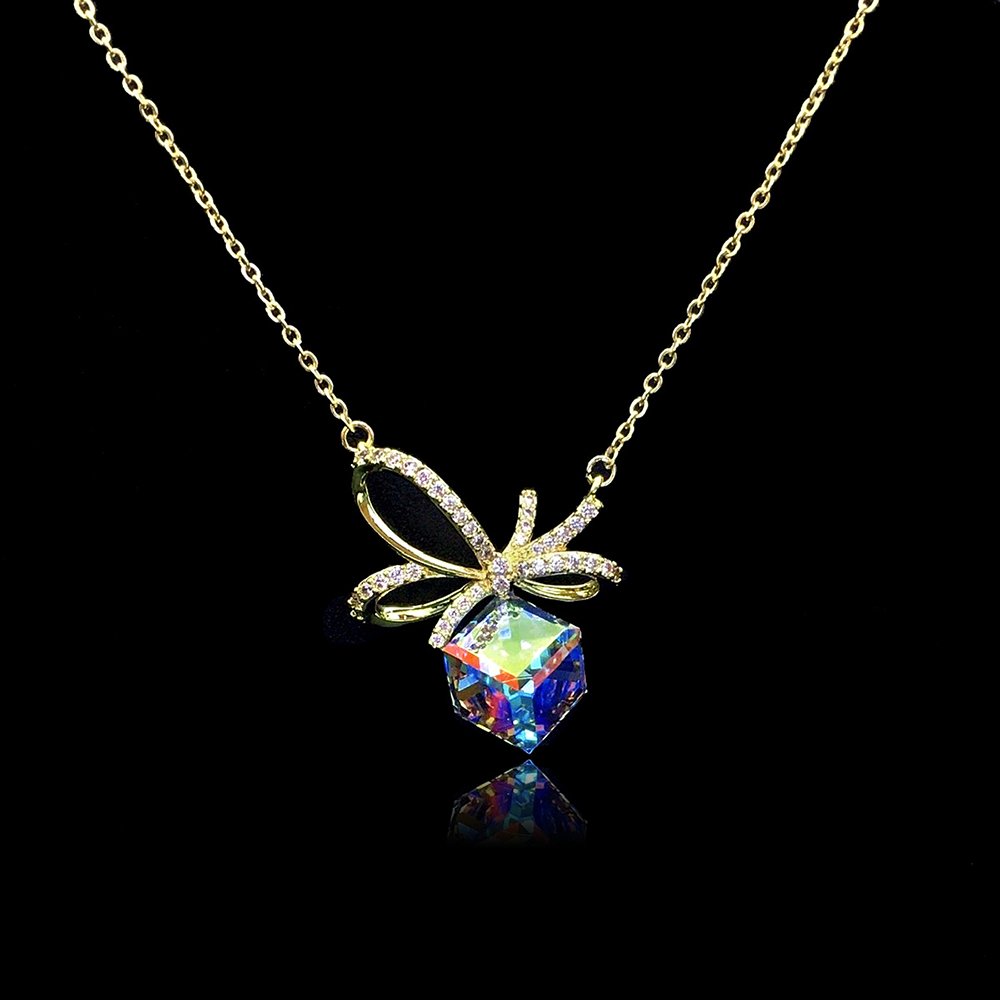 Sleek 14k gold-plated with geometric cube stones. Durable brass core, Swarovski element crystals bow pendant necklace. Perfect for luxury boutiques. Bulk discounts available.