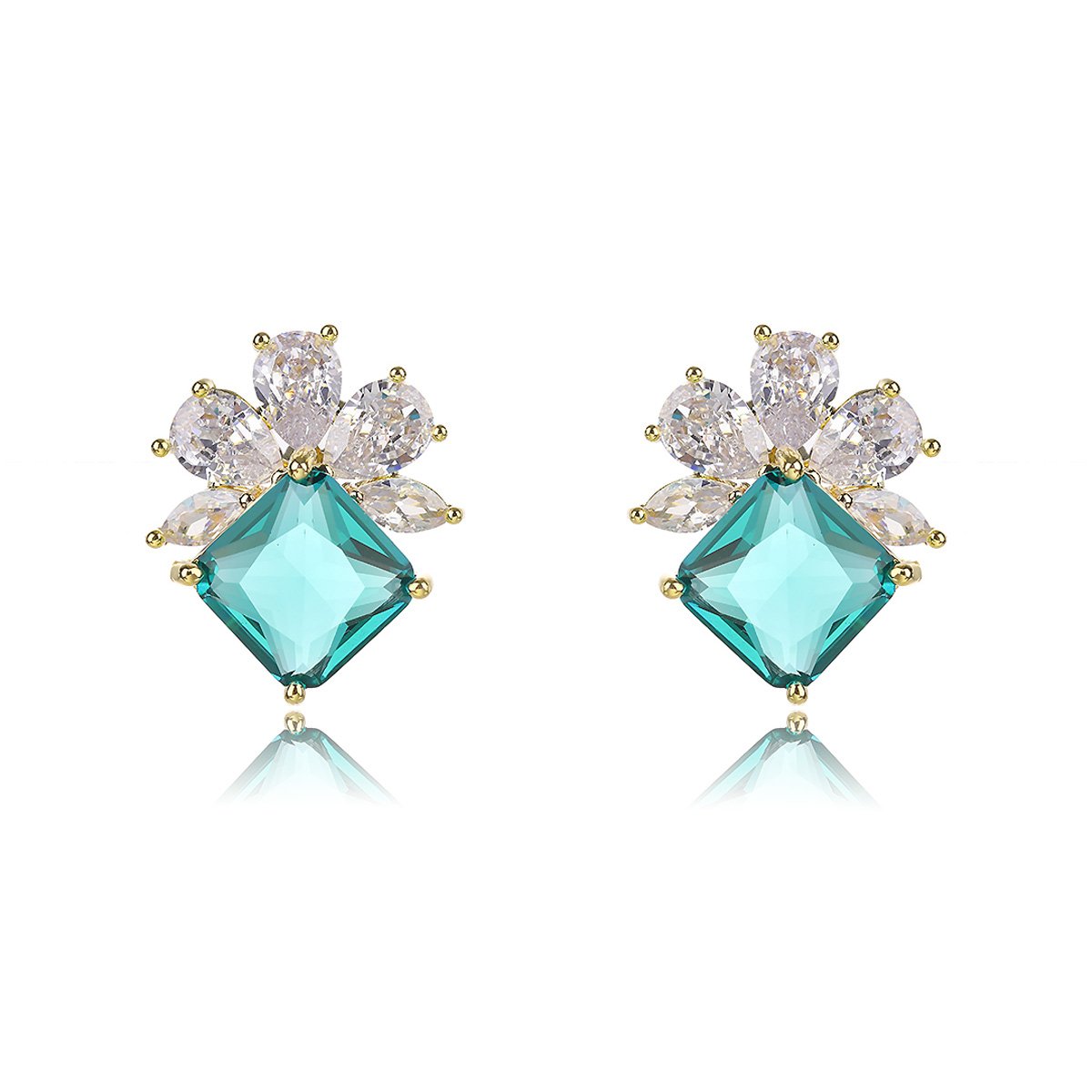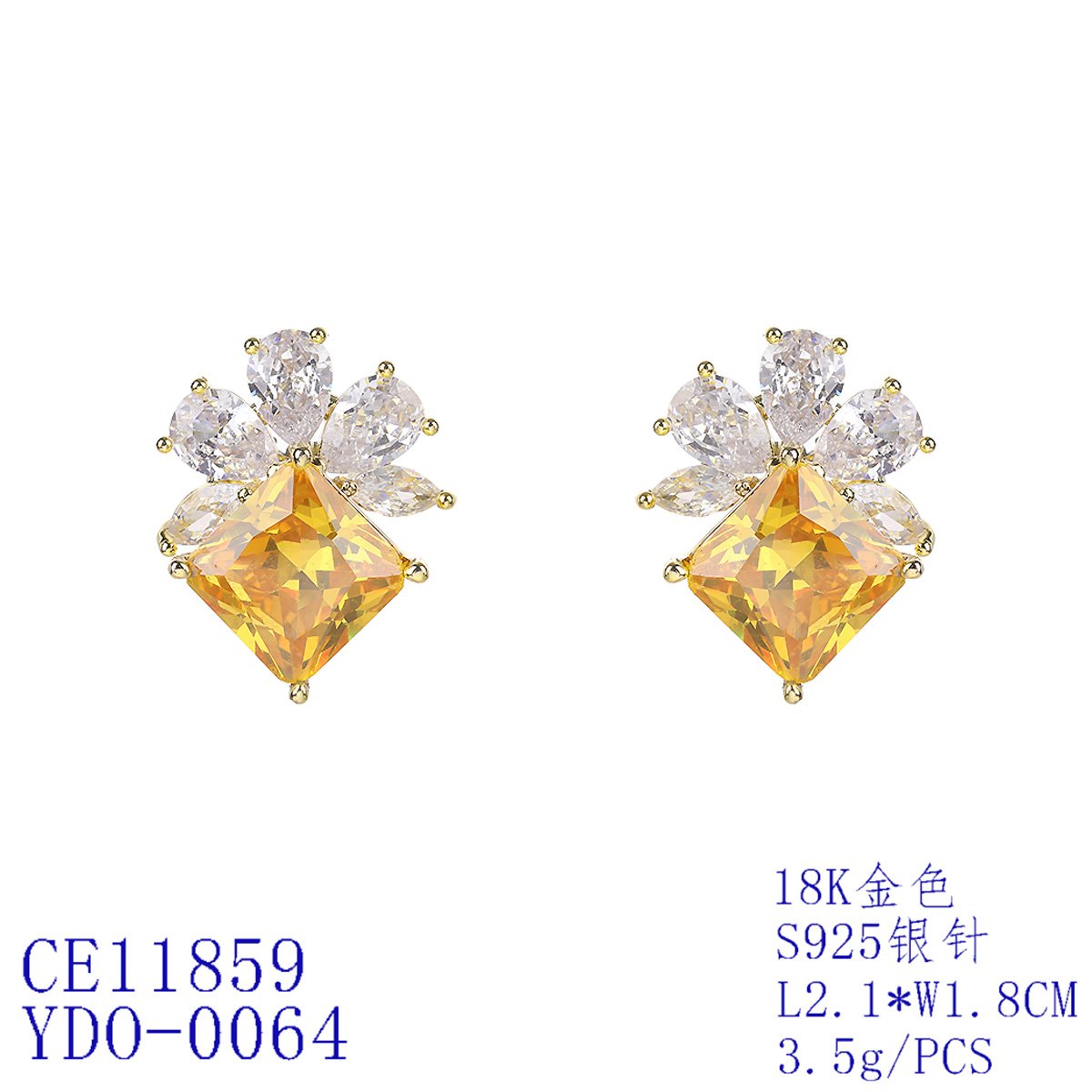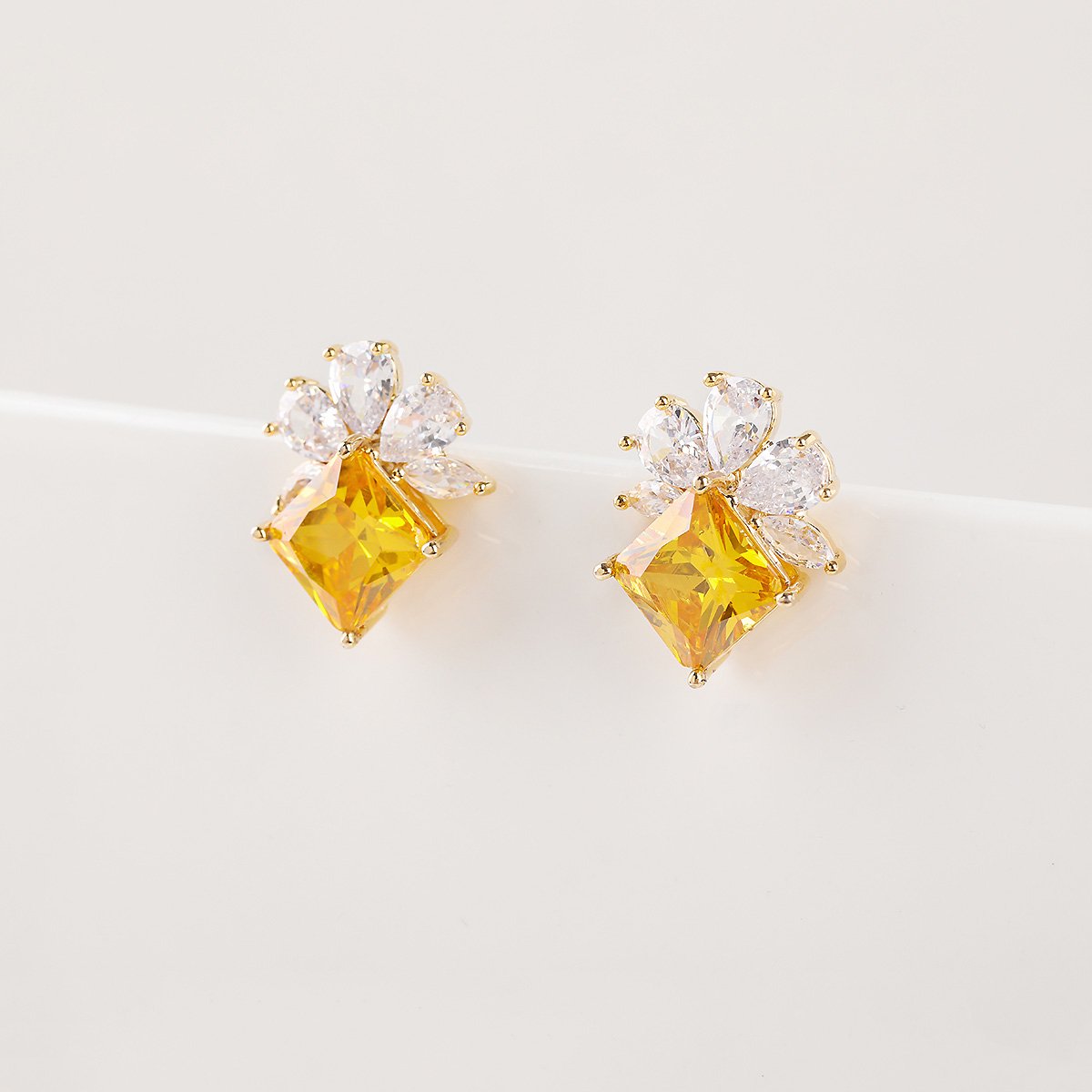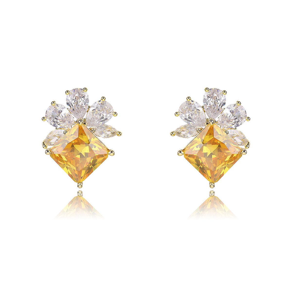 Stock your store with our Wholesale Gemstone Stud Earrings. This elegant design combines classic sparkle with a touch of color. Each earring features a brilliant, square-cut yellow gemstone. The center stone is surrounded by five clear teardrop-shaped zircons. These form a delicate flower-like cluster. The design is both timeless and eye-catching.