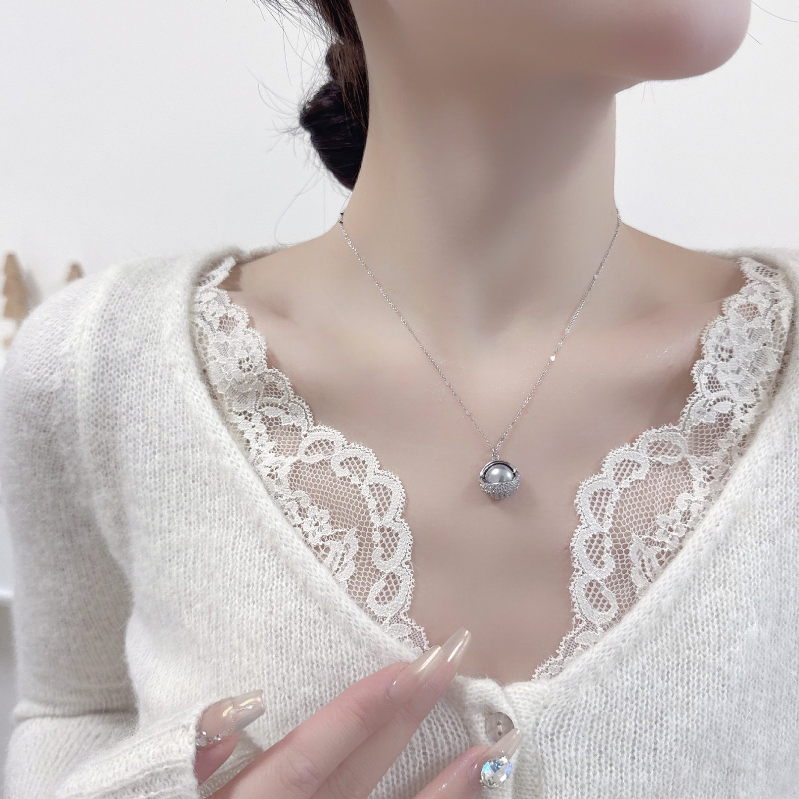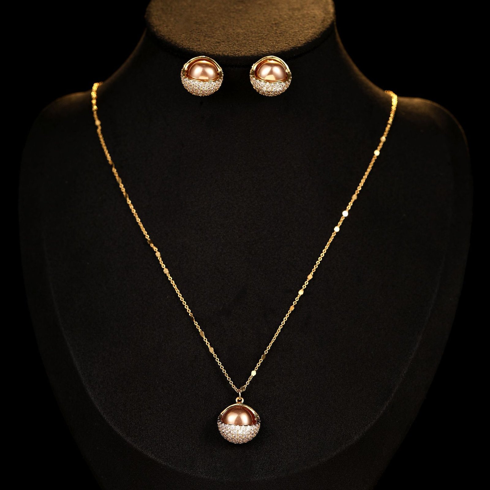 Wholesale Pearl Zircon Half Ball Set showing both the Rose Gold Plated version (Champagne Pearl) and the Silver Plated version (Gray Pearl) on black display mannequins.