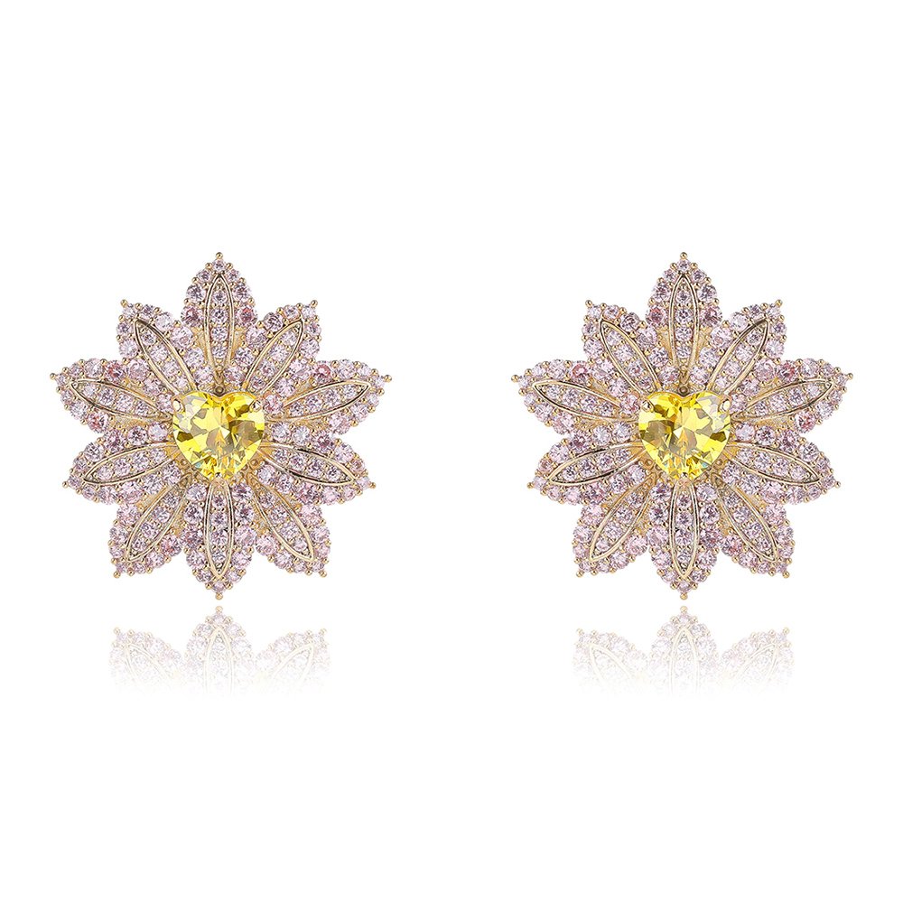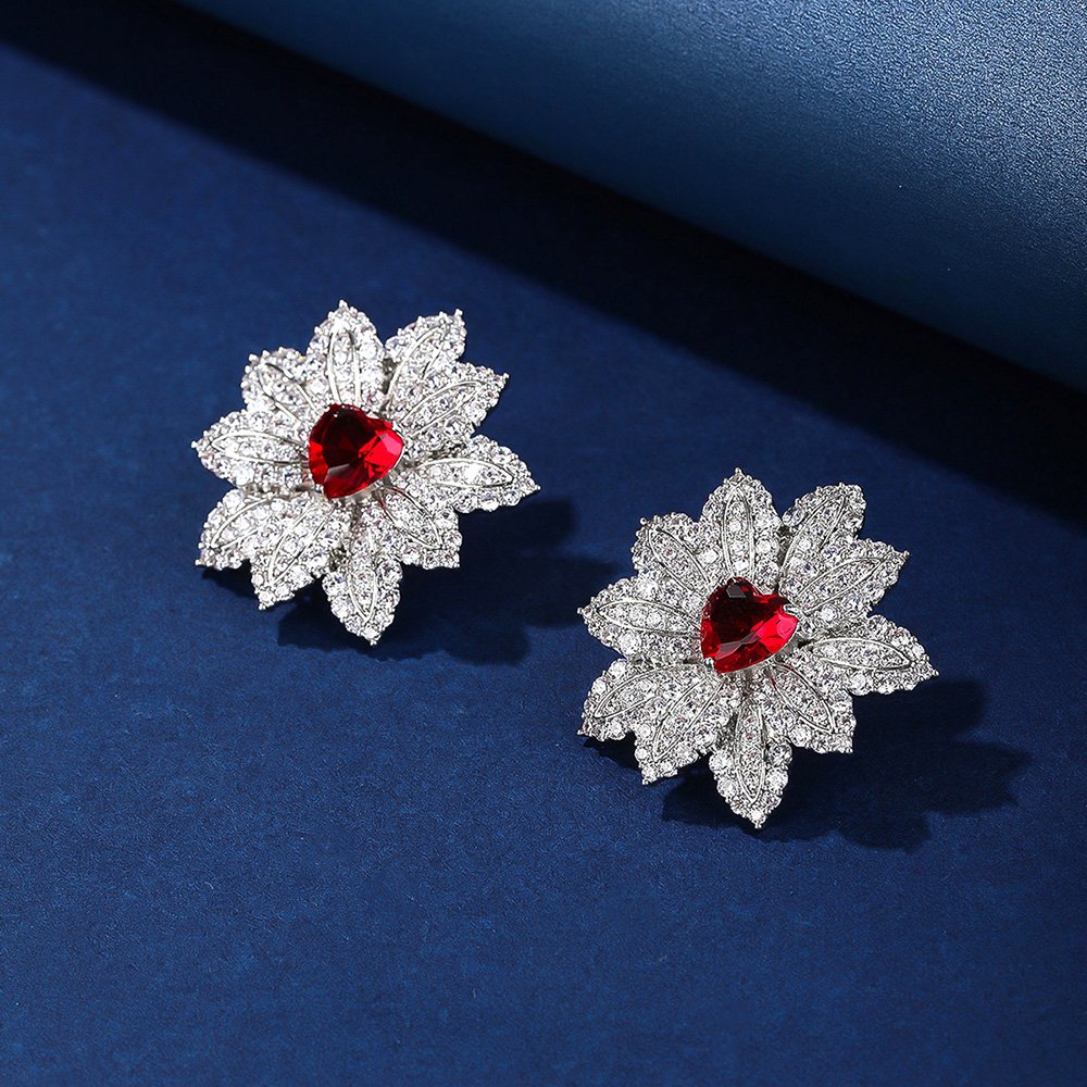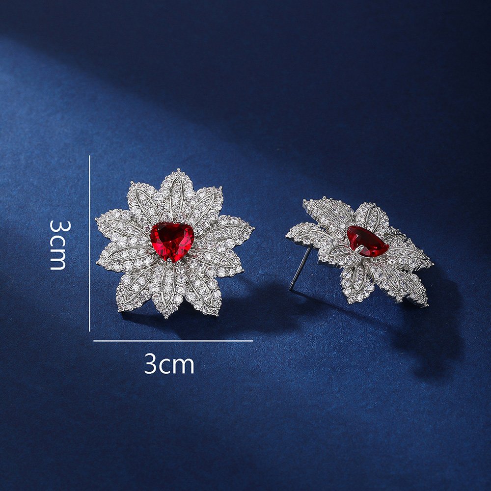 Elevate your accessory offerings with our Wholesale Red Heart Earrings—we have masterfully blended romantic elegance with modern craftsmanship. These striking earrings feature a vibrant, heart-shaped red zircon centerpiece that symbolizes love and passion. Our artisans surrounded the central gem with layers of shimmering white zircon petals to create a blooming flower effect. We set these premium stones on a durable copper base and finished them with high-quality real gold plating.