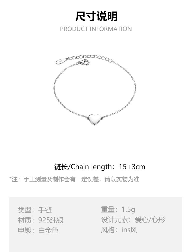 Celebrate understated elegance with our Wholesale Sterling Silver Heart Bracelet, featuring a sleek, polished heart charm on a minimalist silver chain. Crafted from authentic 925 sterling silver and coated with triple-layer vacuum platinum plating, this dainty design offers long-lasting shine and a refined finish. Its simple yet heartfelt aesthetic makes it perfect for everyday wear, gift collections, and ins-inspired jewelry lines. Designed for international resellers, fashion boutiques, and cross-border eCommerce, this piece is available with factory-direct pricing, free global shipping, and consistent quality from JuneJewelry.com – your trusted wholesale silver jewelry partner.