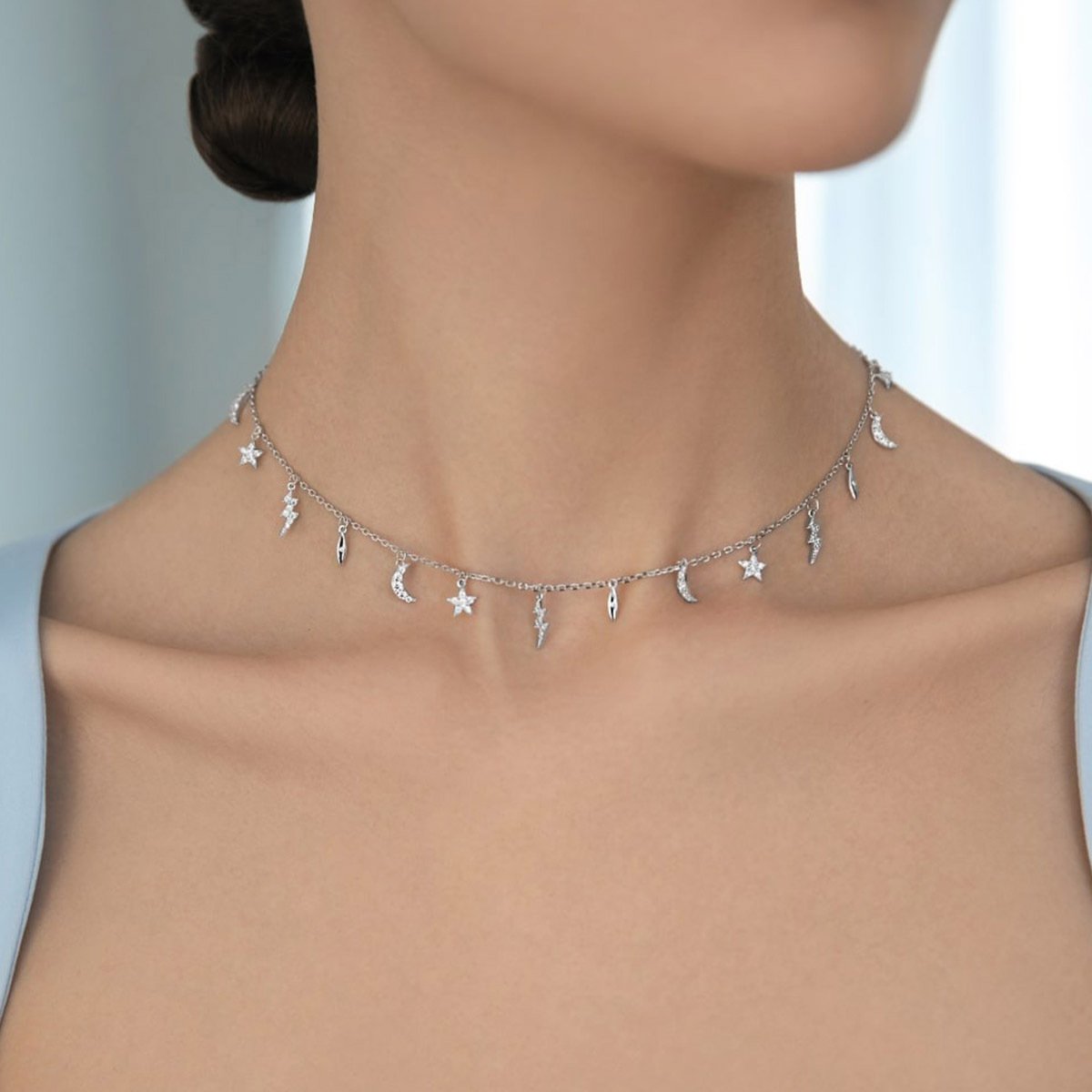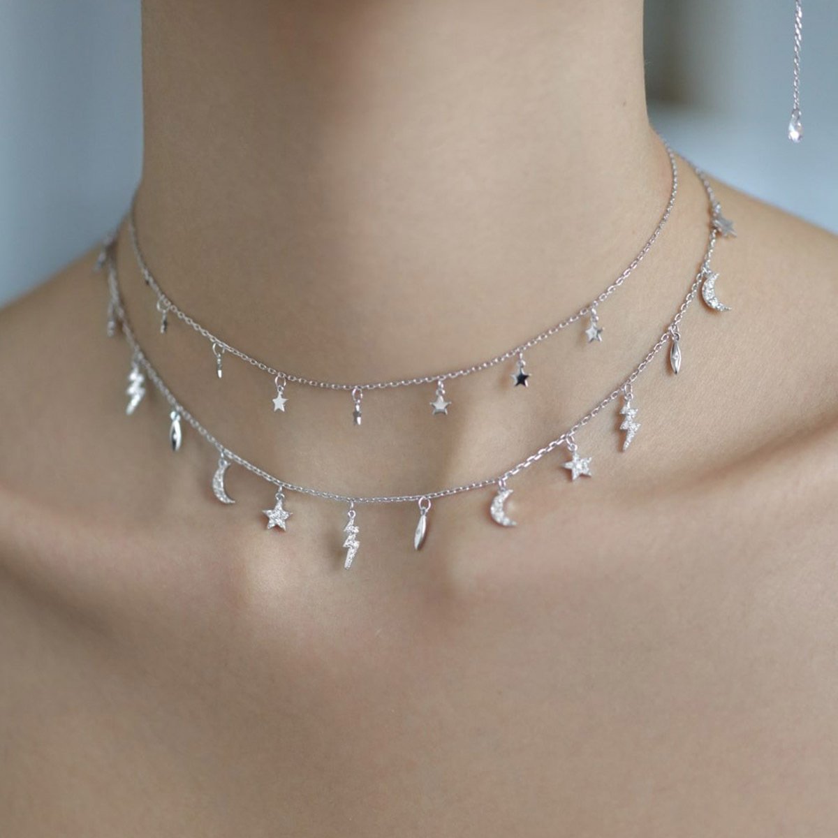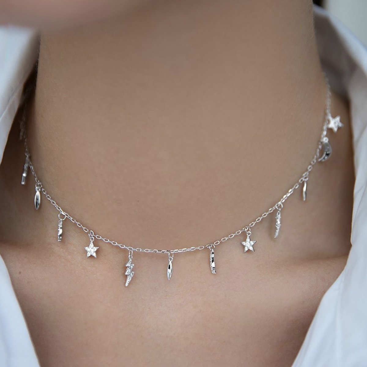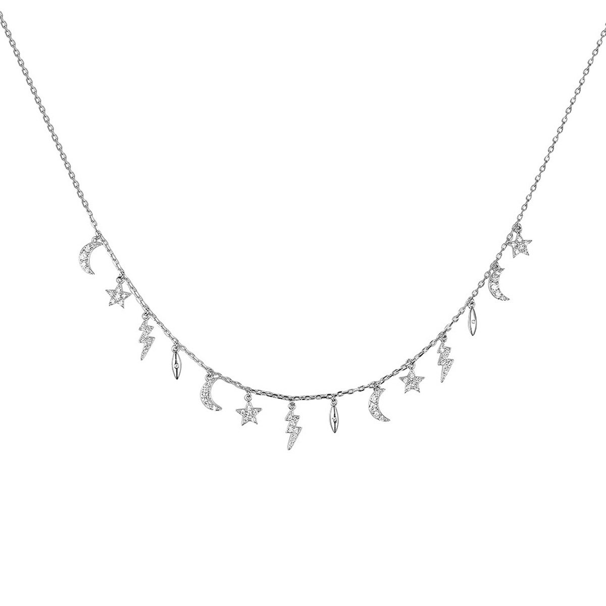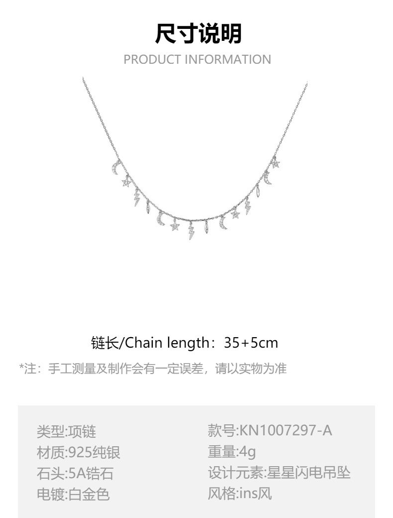 Add a spark of style with our Wholesale Sterling Silver Star Necklace, featuring a trendy celestial theme with star and lightning pendants. Crafted from high-quality 925 sterling silver and finished with triple-layer vacuum platinum plating, this ins-inspired necklace combines elegance and individuality with long-lasting shine. Its dainty design and symbolic elements make it a top choice for boutiques, fashion jewelry stores, and international wholesalers. Offered at factory-direct prices with free global shipping, this unique statement piece delivers both quality and value to your bulk jewelry collection—exclusively at JuneJewelry.com.