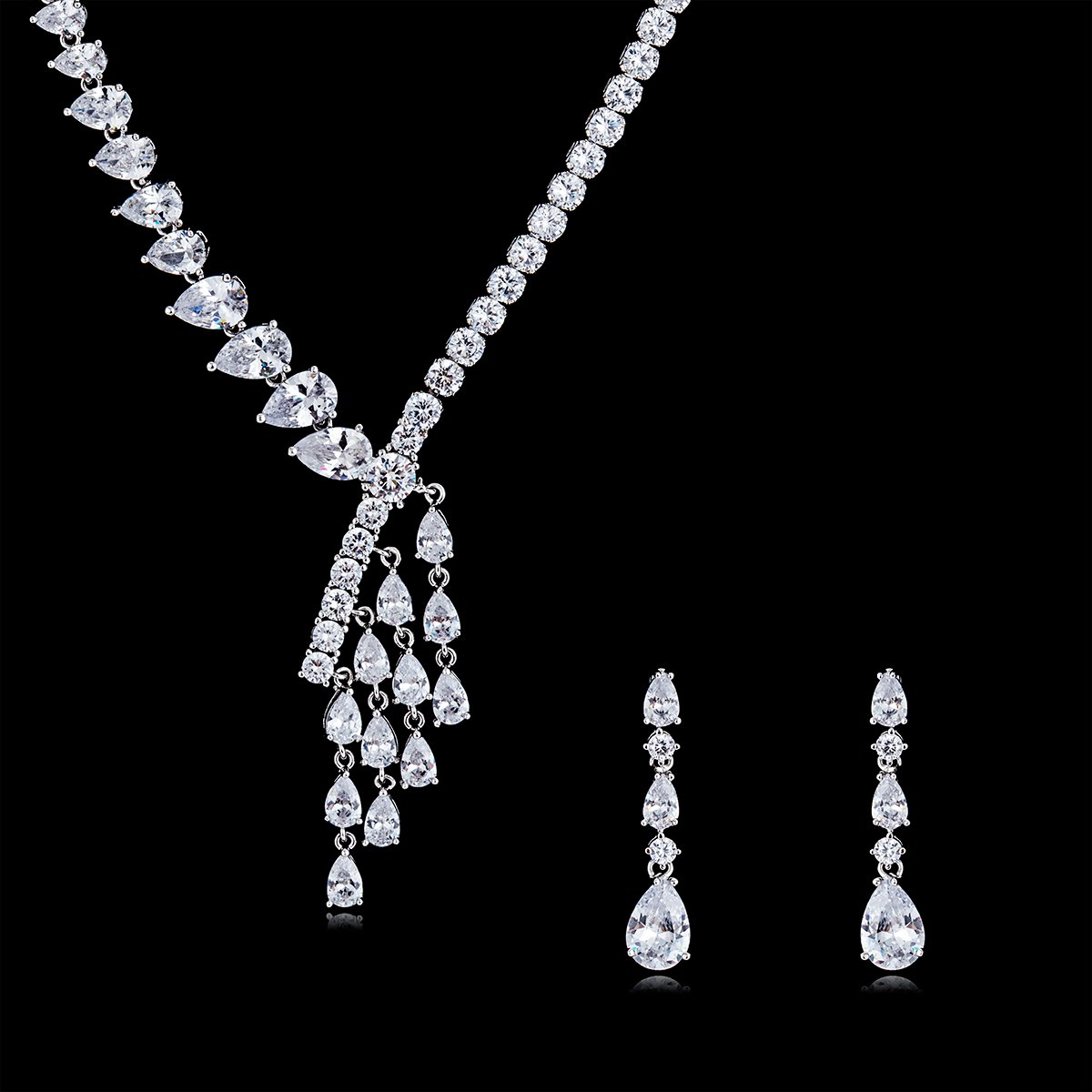 Discover our exquisite wholesale pear-cut zirconia jewelry set, a perfect addition for fashion-forward boutiques. This stunning set features a meticulously crafted necklace and matching earrings, adorned with brilliant pear-cut cubic zirconia stones that shimmer like genuine diamonds. Each piece is constructed from high-quality copper and meticulously electroplated with platinum, ensuring enduring brilliance and resistance to tarnish. We offer these sets at competitive factory prices, making luxury accessible for your wholesale inventory.